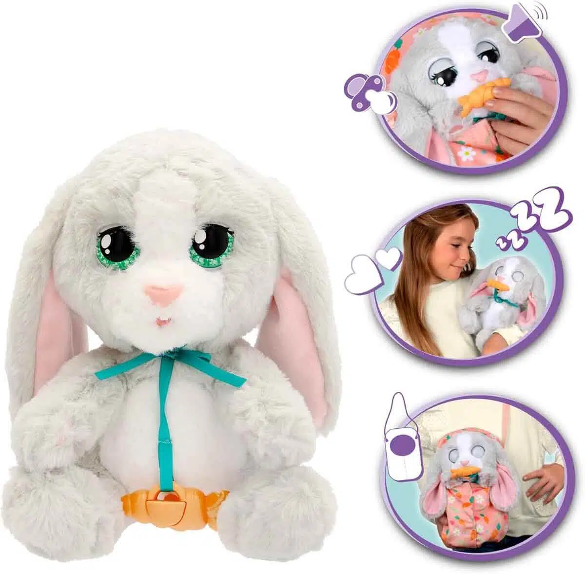 Havuç yemeyi çok seven tavşanın emziği de havuç şeklinde! Çok fazla oyun oynayınca yoruluyor ve uyumak istiyor. Emziğini takabilir ve sevimli dostunun uyumasına yardımcı olabilirsin. Tavşan emziği takılınca gözlerini kapatıyor ve tatlı sesler çıkararak uykuya dalıyor. Emziği çıkardığın zaman gözlerini açıyor ve uyanıyor. Çanta şeklindeki battaniyesine yerleştirerek onu takabilir ve istediğin yere yanında kolaylıkla götürebilirsin. Bu sayede oyun eğlencesi sen neredeysen orada iyi ki varsın sevimli dostum!