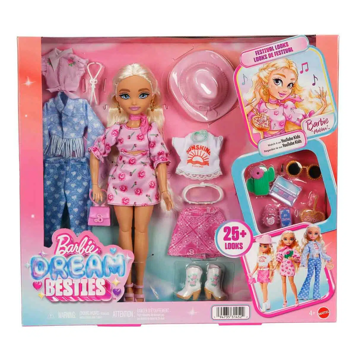 Kutu içerisinde; Barbie Malibu bebek, 5 parça kıyafet, şapka, gözlük, parfüm, makyaj paleti, 2 adet çanta, telefon kılıfı, kolye, kemer, bot ve telefon bulunmaktadır.