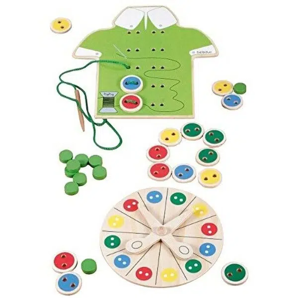 Çocuklar iğne, iplik, makas ve düğmelerden oluşan bu elbise dikme oyununu çok sevecekler.