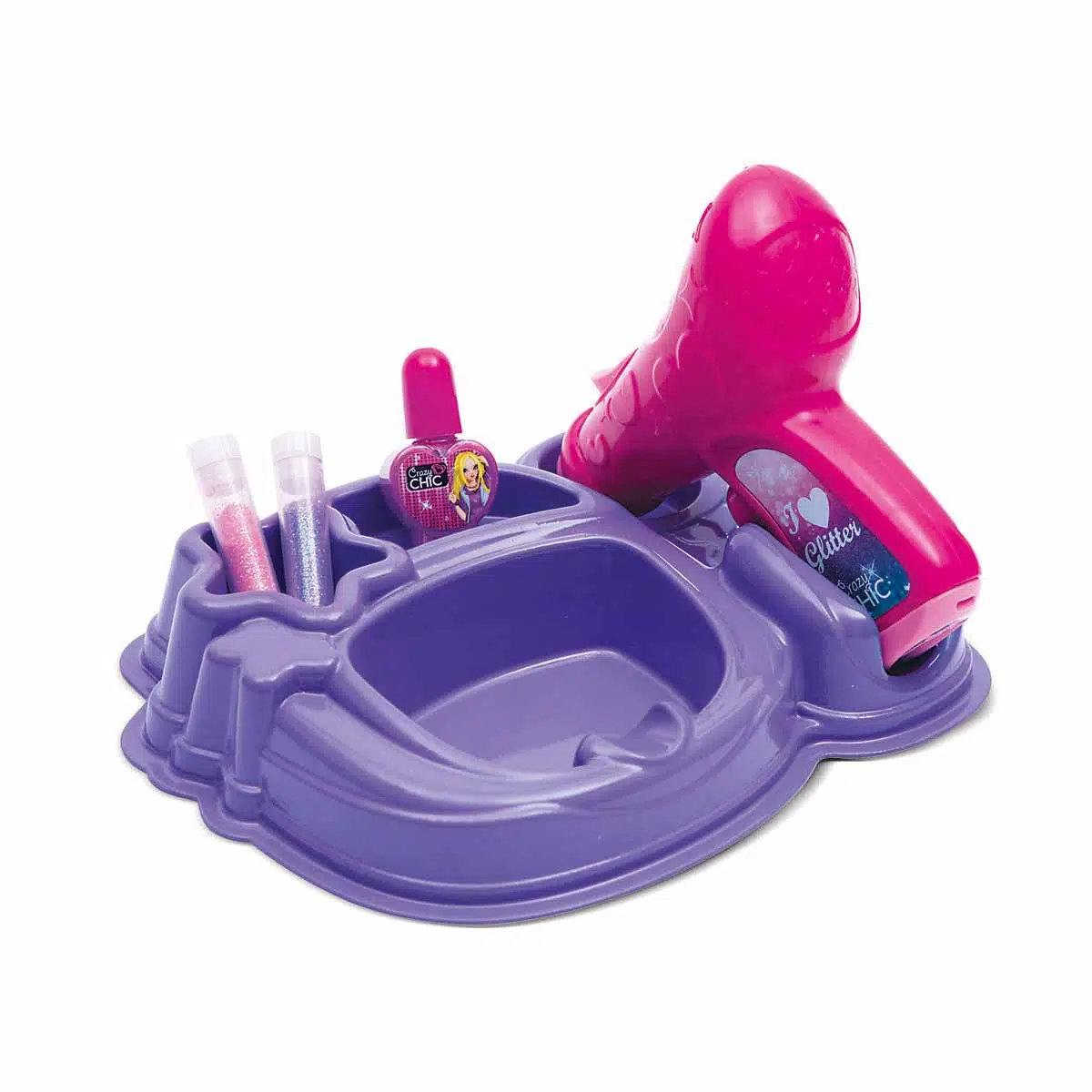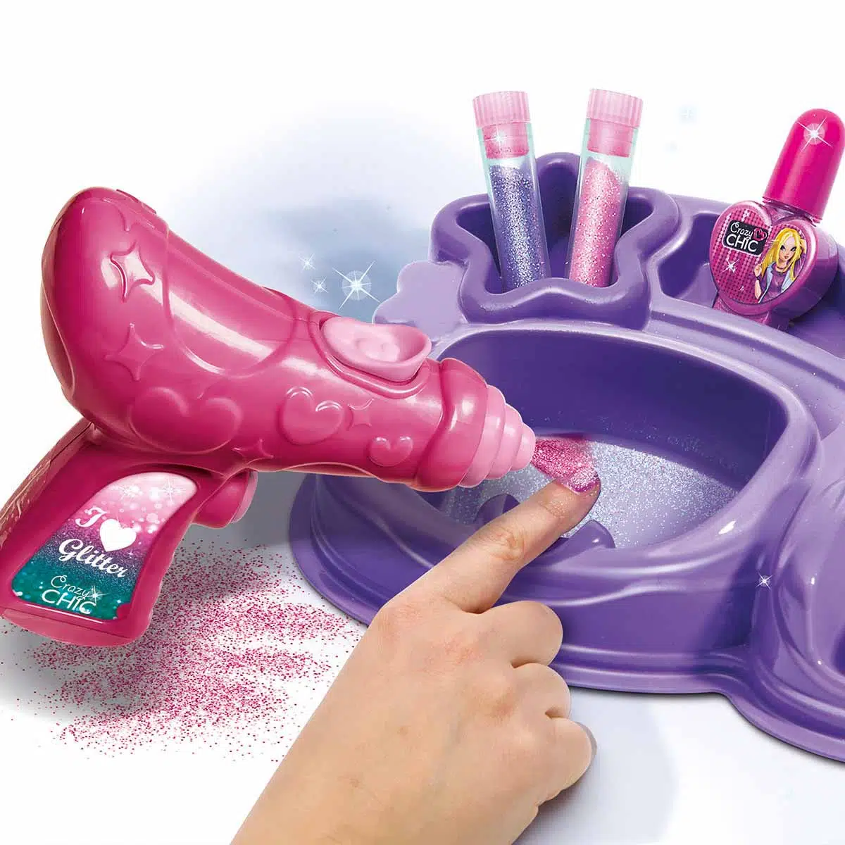Crazy Chic Işıldayan Tırnaklar seti; bir parıltı püskürtme makinesi, harika bir soyulabilen aseton içermeyen oje ve her zaman mükemmel olan tırnaklar için 2 adet renkli parıltı içerir.