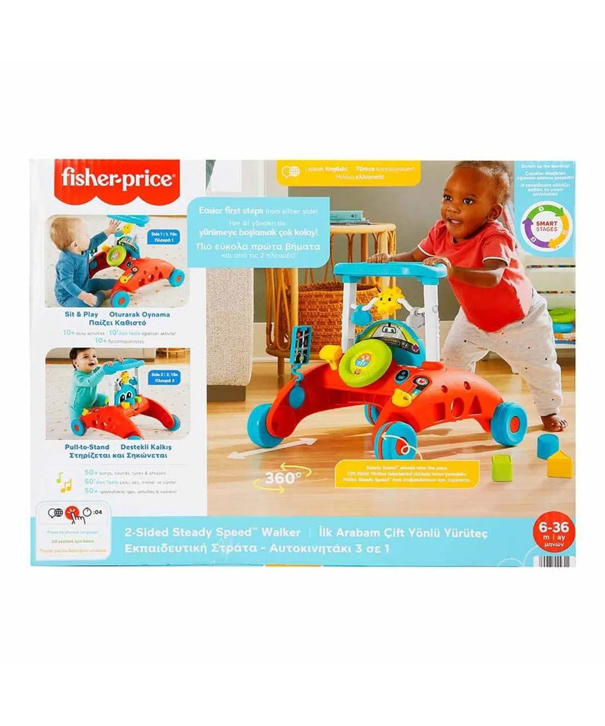 Fisher-Price® İlk Arabam™ Çift Yönlü Yürüteç, oturmaktan ayağa kalkmaya ve ilk adımlara kadar bebeğinizle birlikte büyüyen, etkileşimli ve eğitici bir oyuncaktır. Bu araba temalı yürüteç, yürümeyi yeni öğrenen bebeklerin ayakta durmasına ve yavaşça hareket etmesine yardımcı olmak için iki yana dönebilen İlk Arabam™ tekerleklerine sahiptir. Yürütecin her iki yanında da ilgi çekici oyuncaklar bulunur. Direksiyon ve etkileşimli gösterge paneli, araba sürme temalı canlandırma oyunlarına ilham verir. Ayrıca 3 Yaşa Göre Gelişim® oyun seviyesi, minik sürücüler büyüyüp etrafta 'gezinirken' onlara alfabeyi, zıt anlamlı kelimeleri ve sayı saymayı öğretmenize yardımcı olur. Dili seçmek için dünya düğmesini kullanın: İngilizce, Türkçe veya Yunanca dilleri arasında seçim yapabilirsiniz.
