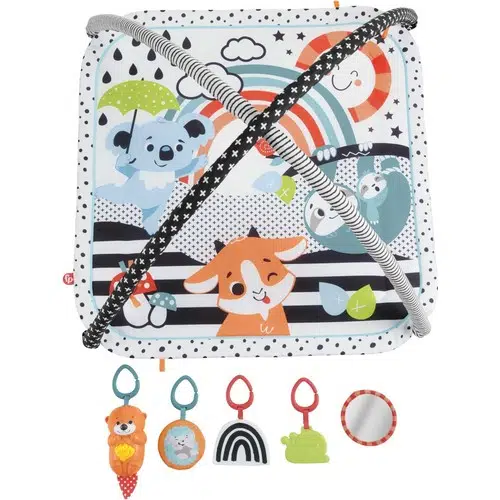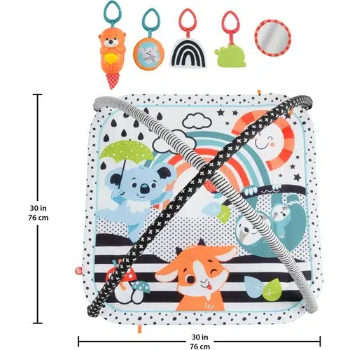 Fisher-Price Neşeli Hayvanlar 3'ü 1 Arada Jimnastik Merkezi™ oyun minderi, miniklerin hem eğlenceli vakit geçirmesine hem de kişisel gelişimlerine yardımcı olur. Yenidoğanların uzanabileceği, dokunabileceği ve kavrayabileceği, takılıp çıkarılabilir 5 aktivite oyuncağı arasında ayna, çıngıraklı yumuşak oyuncak kirpi, BPA içermeyen salyangoz dişlik, hışırtılı oyuncak gökkuşağı, müzikli ve ışıklı su samuru yer alır. Su samuru 15 dakika boyunca müzik çalarak ve hafif bir ışık yayarak miniklerin sadece oyun minderinde değil, bulundukları her ortamda neşeli ve keyifli vakit geçirmesini sağlar. Bebeğiniz büyüdükçe iki kemeri geniş ve rahat oyun minderinden çıkarın, böylece bebeğiniz karnı üstünde oynarken kendini yukarı iterek boyun ve karın kaslarını güçlendirebilir. Üstelik jimnastik merkezinin yüksek kontrastlı renkleri, bebeğinizin erken görsel beceriler geliştirmesini destekler. Özellikler: •Doğumdan itibaren tüm bebekler için müzikli ve ışıklı jimnastik merkezi ve takılıp çıkarılabilir 5 aktivite oyuncağı•Müzikli, ışıklı ve yumuşak kuyruklu su samuru, bebeğin kendini keşfedebileceği ayna, çıngıraklı yumuşak oyuncak kirpi, BPA içermeyen salyangoz dişlik, hışırtılı ve çift taraflı oyuncak gökkuşağı olmak üzere 5 aktivite oyuncağı dahildir •15 dakika boyunca müzik çalan ve ışık yayan eğlenceli su samurunu yanınızda taşıyabilirsiniz •Aynadaki yansımasını seyretmek bebeğin kendini keşfetmesine, karakterlerin büyük tasarımlı yüzleri ise görsel gelişimine yardımcı olur •Yüksek kontrastlı renklere sahip, 76 x 76 cm büyük oyun minderi çamaşır makinesinde yıkanarak kolayca temizlenebilir Ürünün Boyutları: 40.64 x 58.42 x 7.62 cm Ürün Ağırlığı (gr): 1171 Yaş Grubu: Birth +