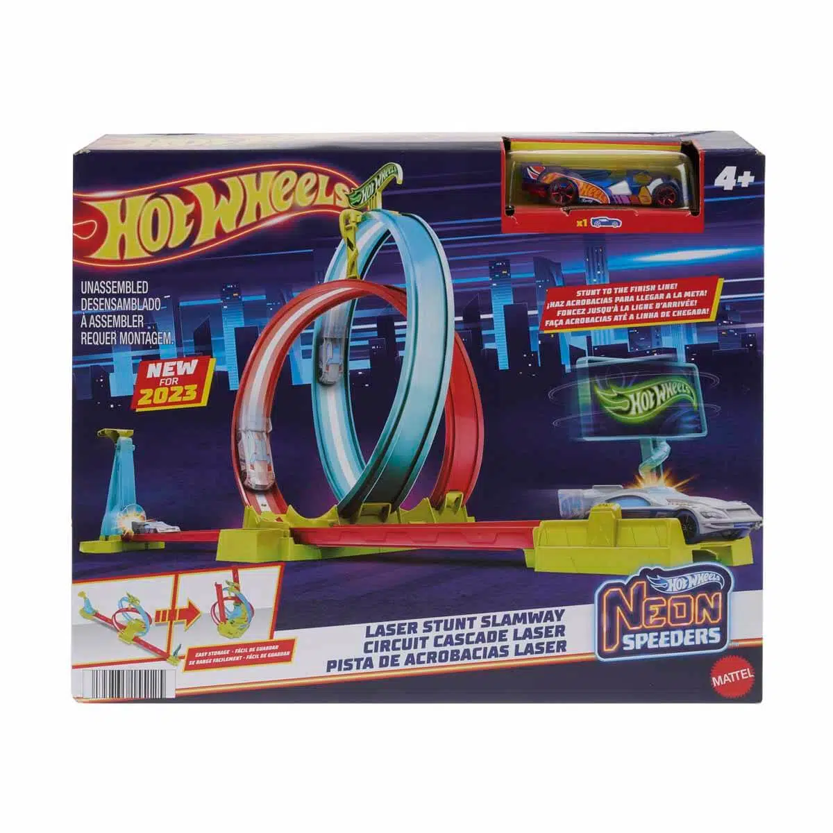 Arabalar spirallerden geçerek bitiş çizgisine kadar yarışır ve araba bitiş çizgisinden geçtiğinde neon temalı pano döner. Açık uçlu oyun için pisti diğer pistlere veya oyun setlerine bağlayın. (Diğer pistler ayrı olarak satılır.)