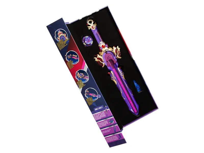 Epic Launcher Deluxe Serisi Sonsuzluk Efsanesi Zorunlu! 50 cm uzunluğunda koleksiyonluk kılıçlar! Saptaki düğmeyi kullanarak kılıcınızdaki ışık efektlerini etkinleştirerek rakibinizi yenin! Zirveyi 2 şekilde fırlatın: kılıcınızı kınındayken veya destansı bir fırlatma için kılıcınızı dışarıda tutarak! Saptaki kolları kullanarak üst kısmın dönüş yönünü seçin. Kılıcı kemerinize asmak için kitte bulunan tutucuyu kullanın.