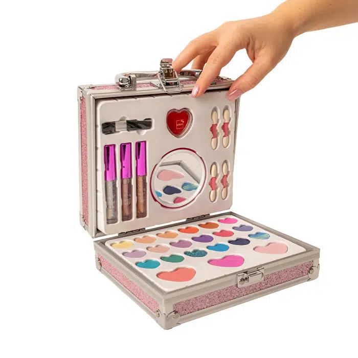 İçeriği: 18 tekli far, 3 büyük allık, ayna, 4 aplikatör, 3 dudak parlatıcısı ve 1 kalp şeklinde allık ve bir far fırçası şeklinde oluşan pratik bir settir.