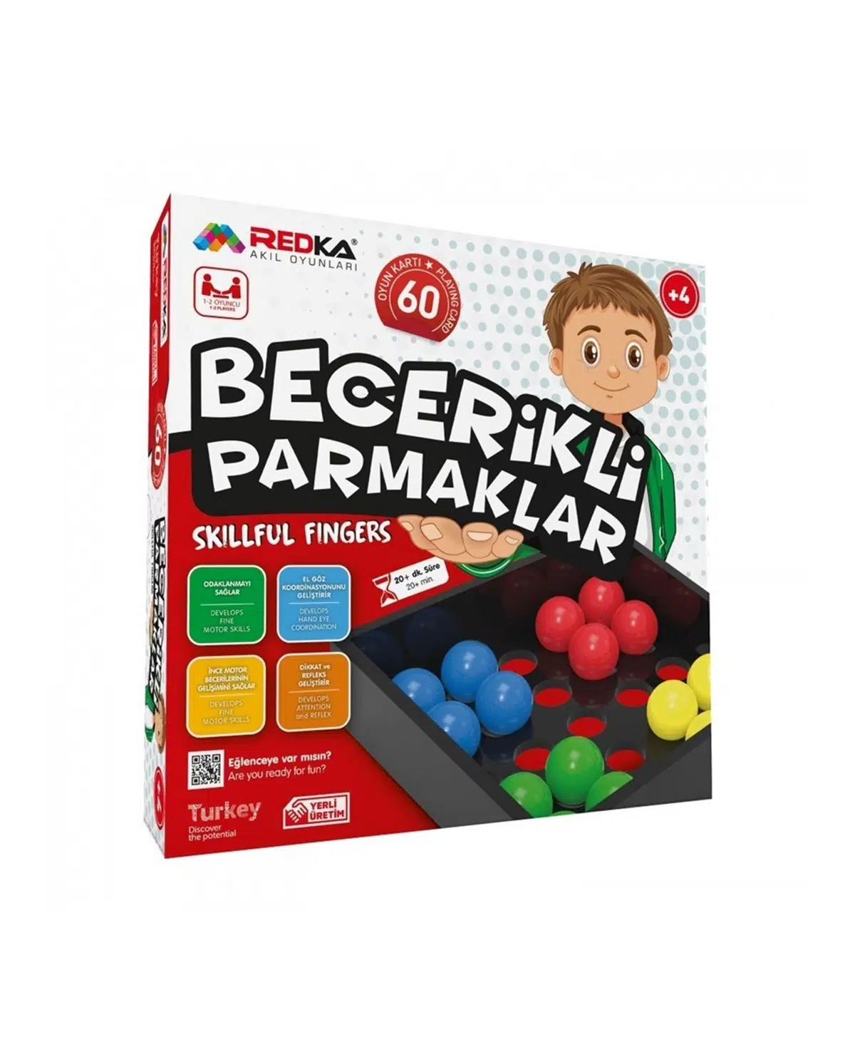 Becerikli Parmaklar Oyunu; 60 adet görev kartı,1 adet kart tutucu,2 adet oyun platformuve 1 adet zilden oluşmaktadır.